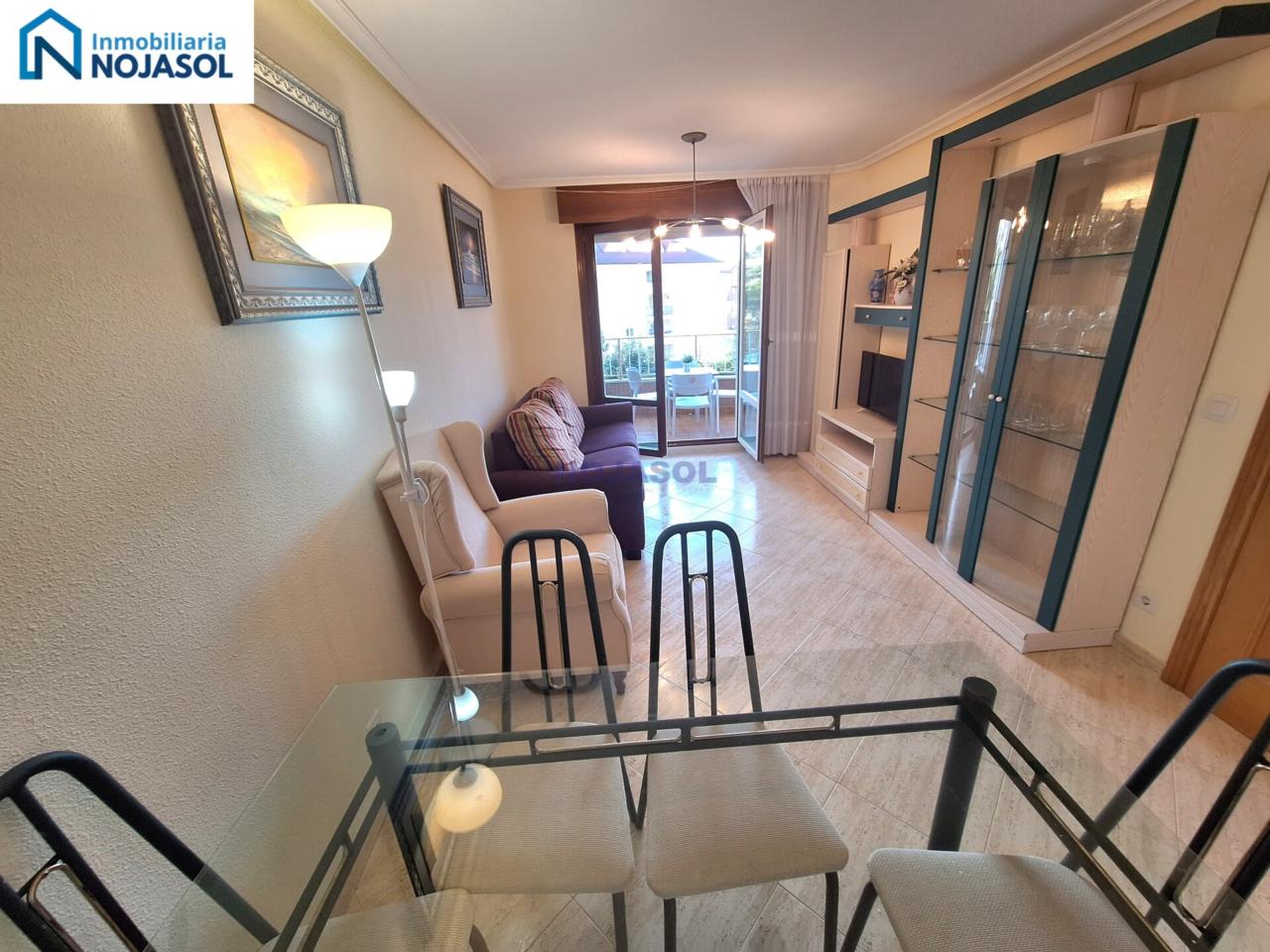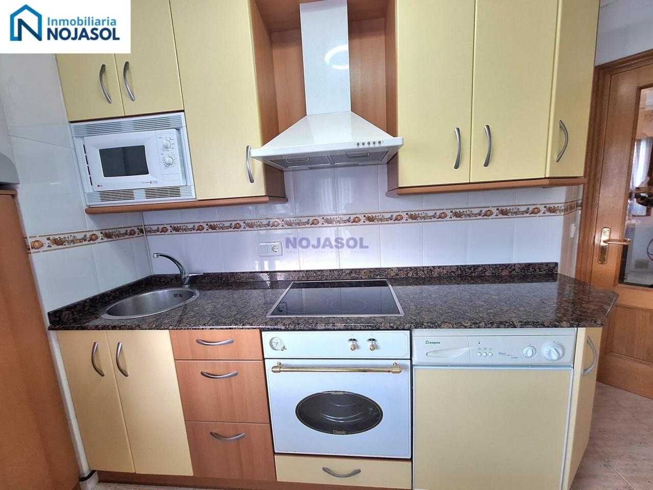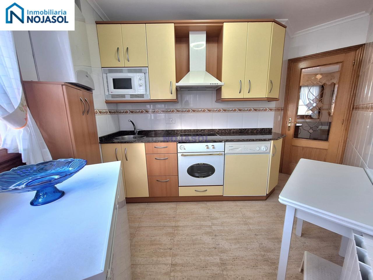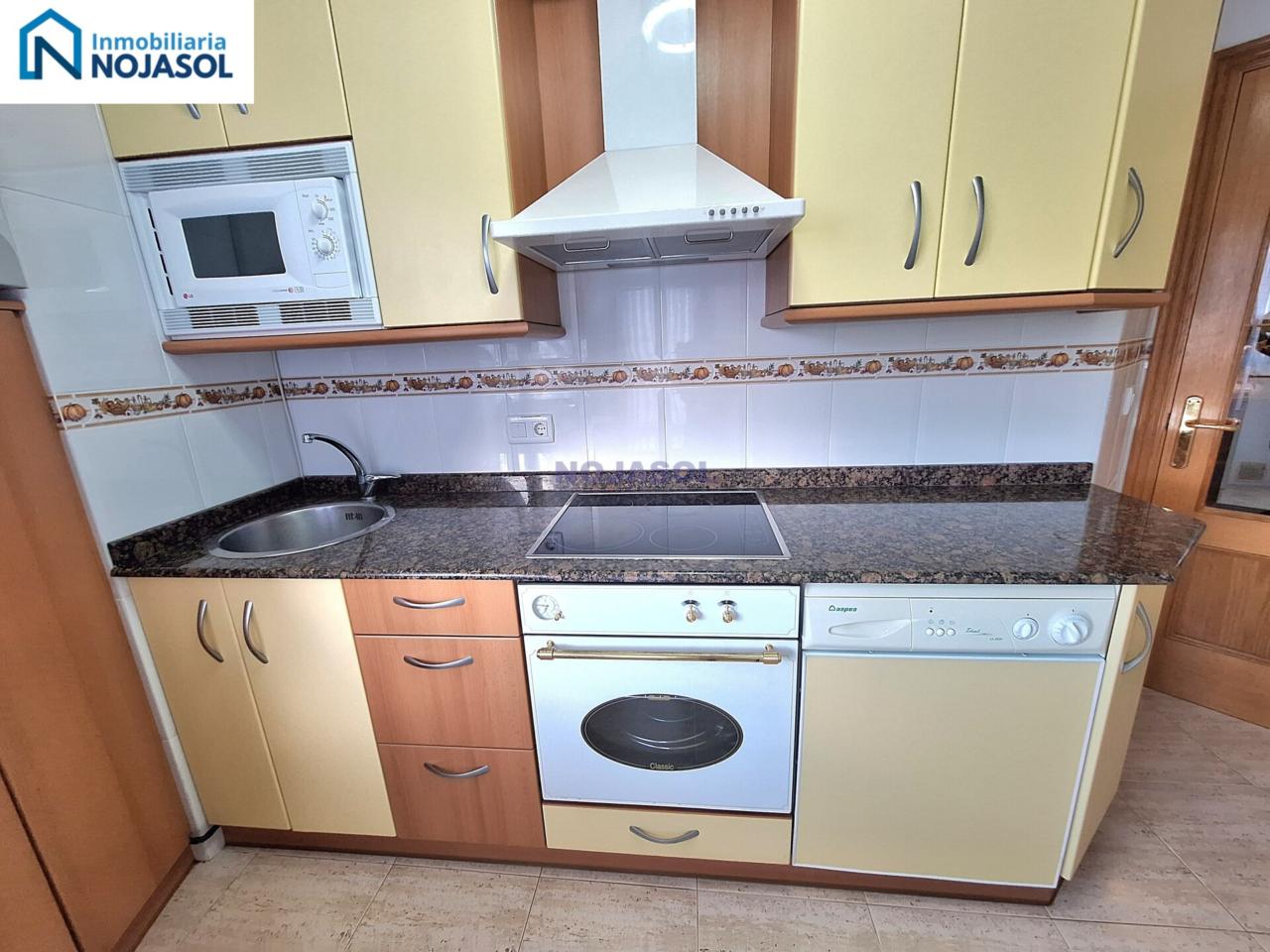 Bonito piso de dos habitaciones con terraza. El inmueble cuenta con una cocina independiente (con microondas, horno, cafetera italiana, exprimidor de zuma natural...). La nevera es mas pequeña que las normales (debajo de un mueble blanco) y tiene un congelador de la misma altura (con lo cual, cada uno tiene su espacio y prácticamente hace la función de una nevera normal). No tiene lavavajillas.