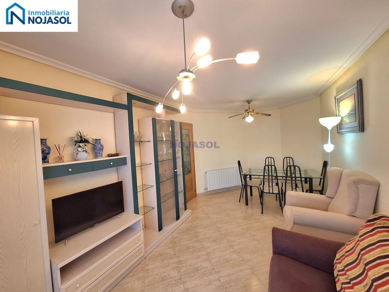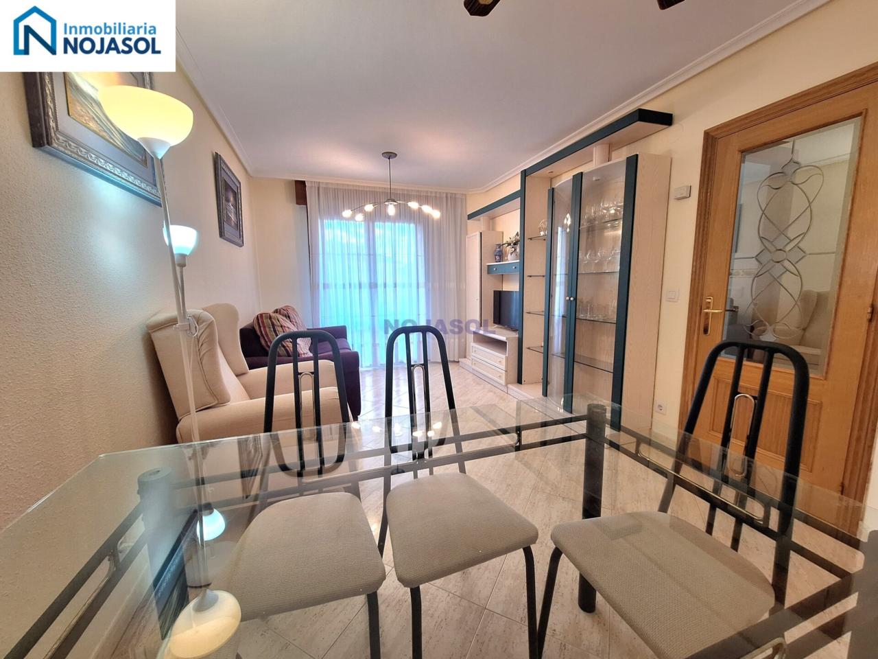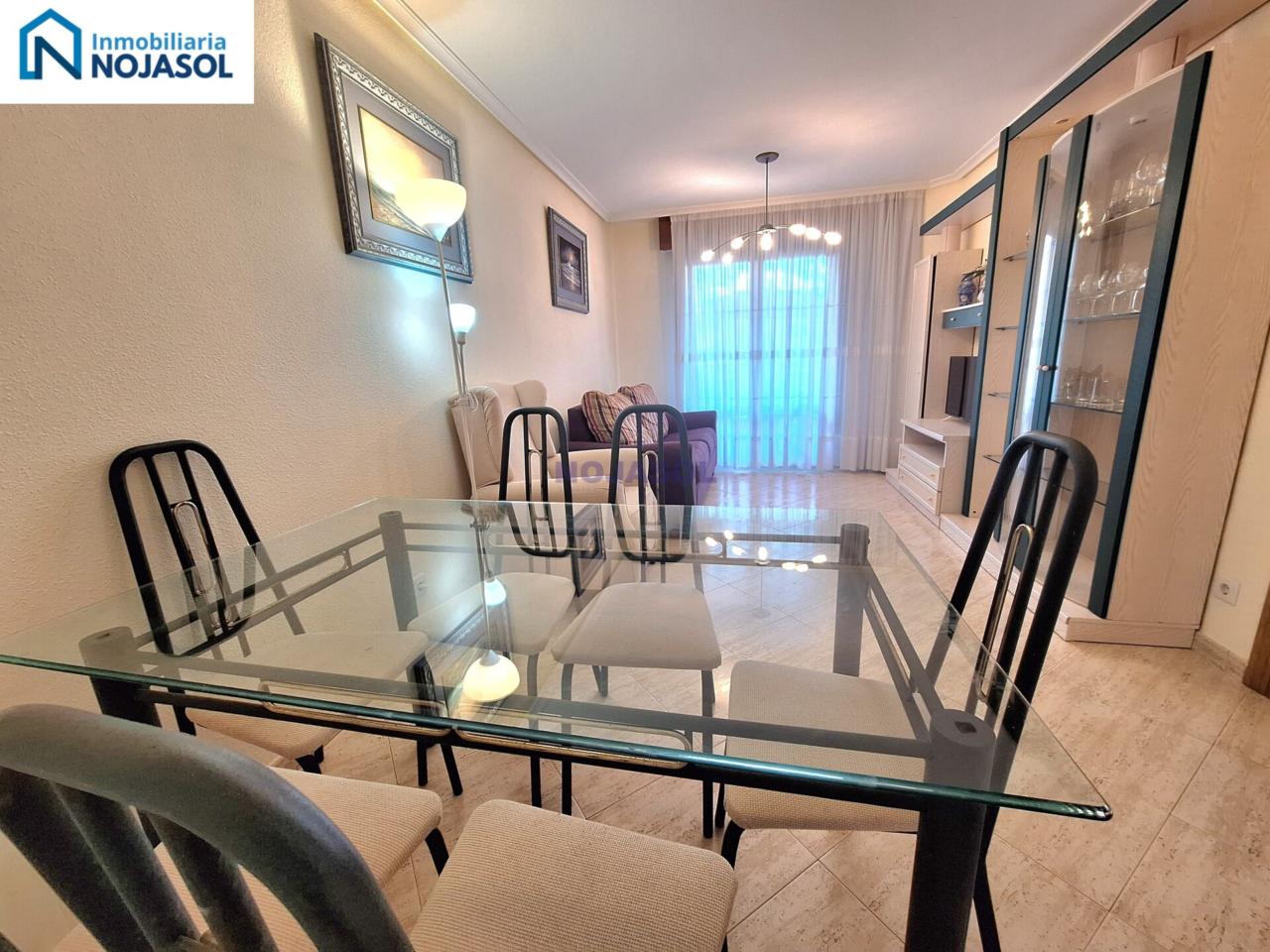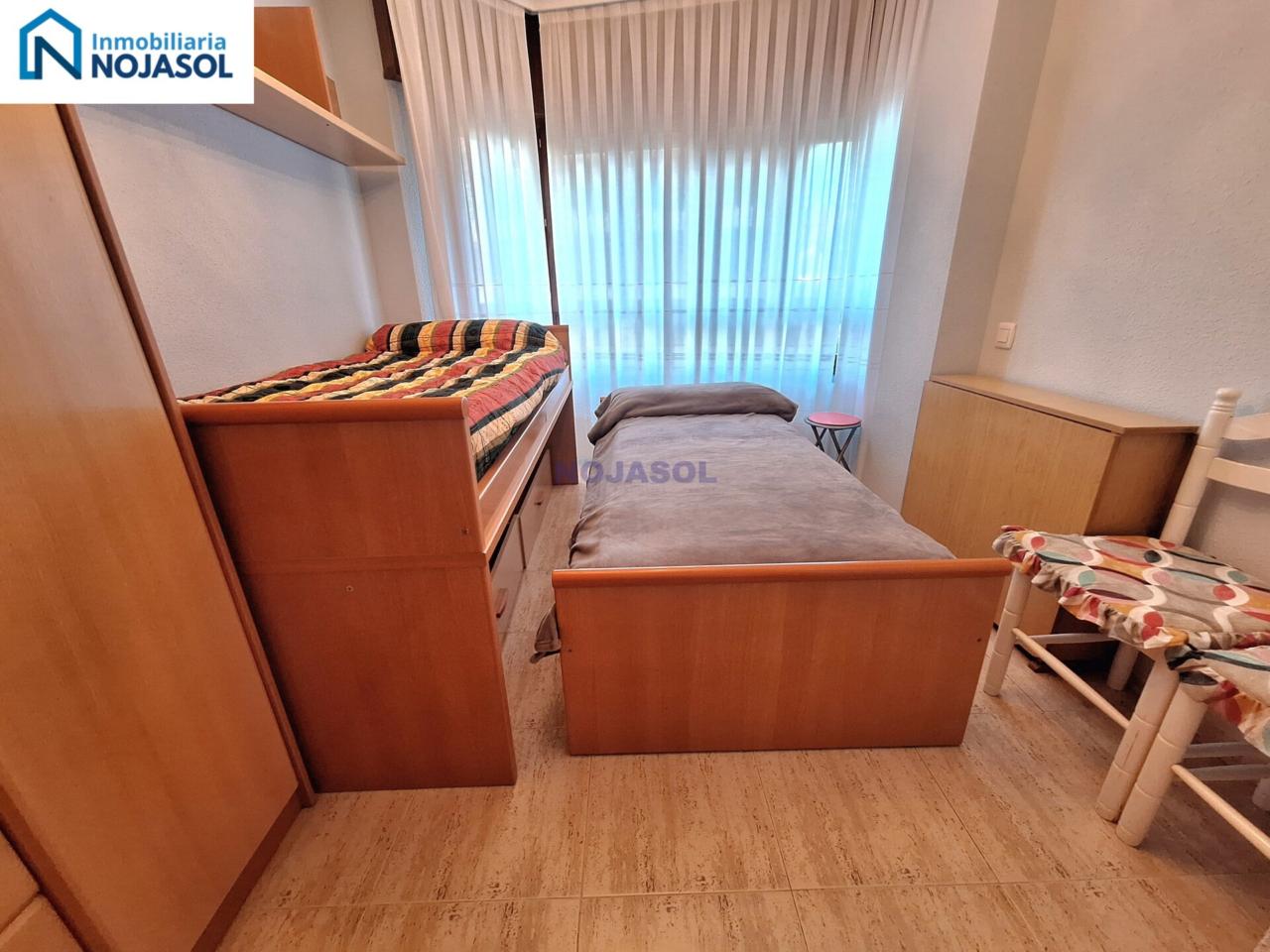 Bonito piso de dos habitaciones con terraza. El inmueble cuenta con una cocina independiente (con microondas, horno, cafetera italiana, exprimidor de zuma natural...). La nevera es mas pequeña que las normales (debajo de un mueble blanco) y tiene un congelador de la misma altura (con lo cual, cada uno tiene su espacio y prácticamente hace la función de una nevera normal). No tiene lavavajillas.