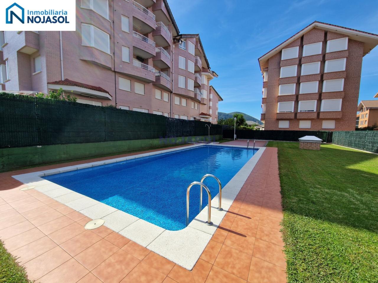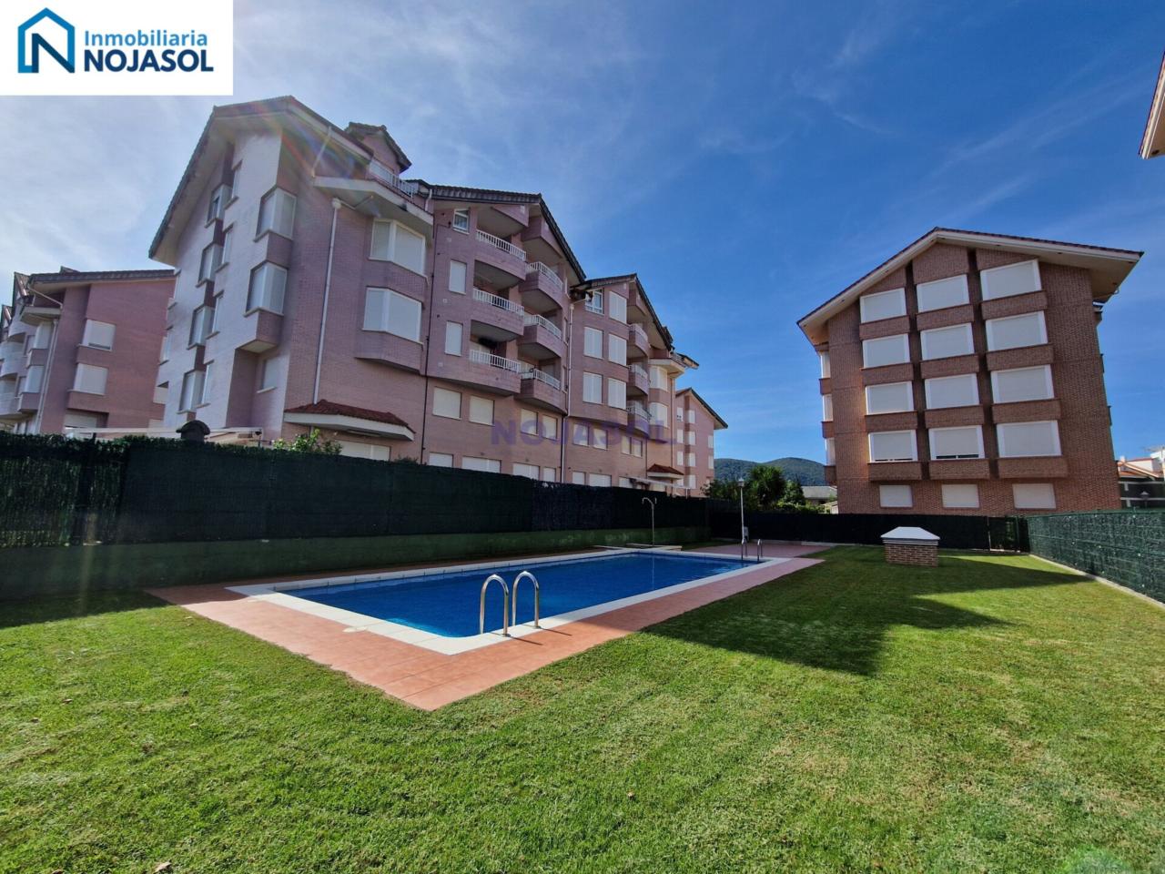 Urbanización cerrada con piscina y jardín comunitario.