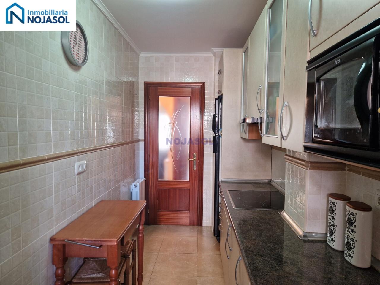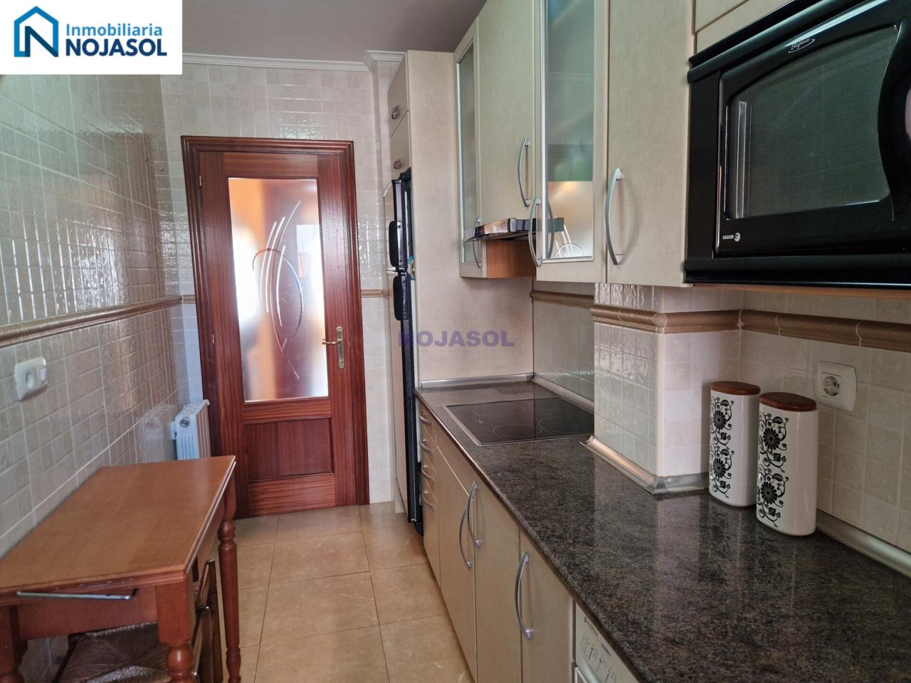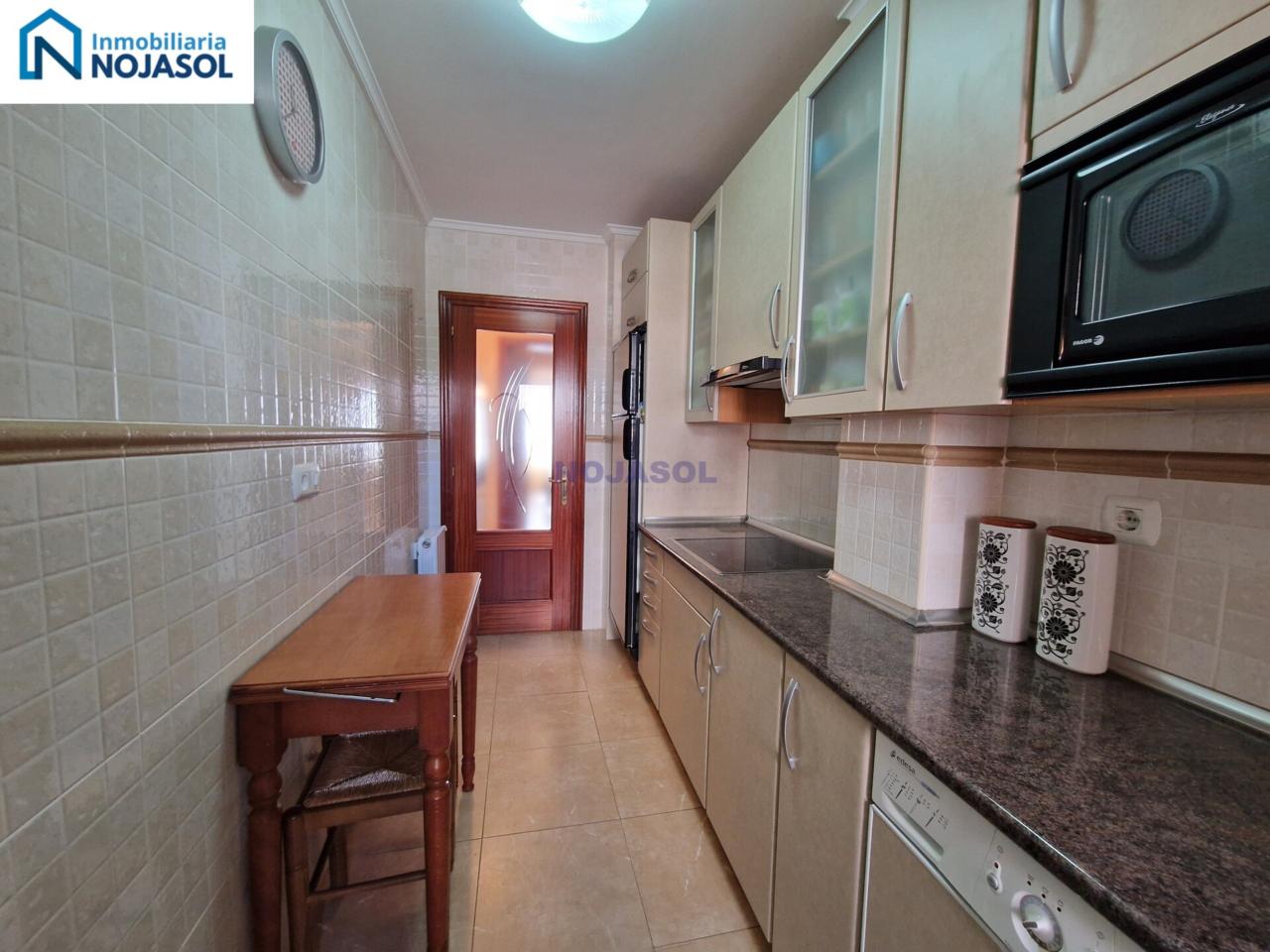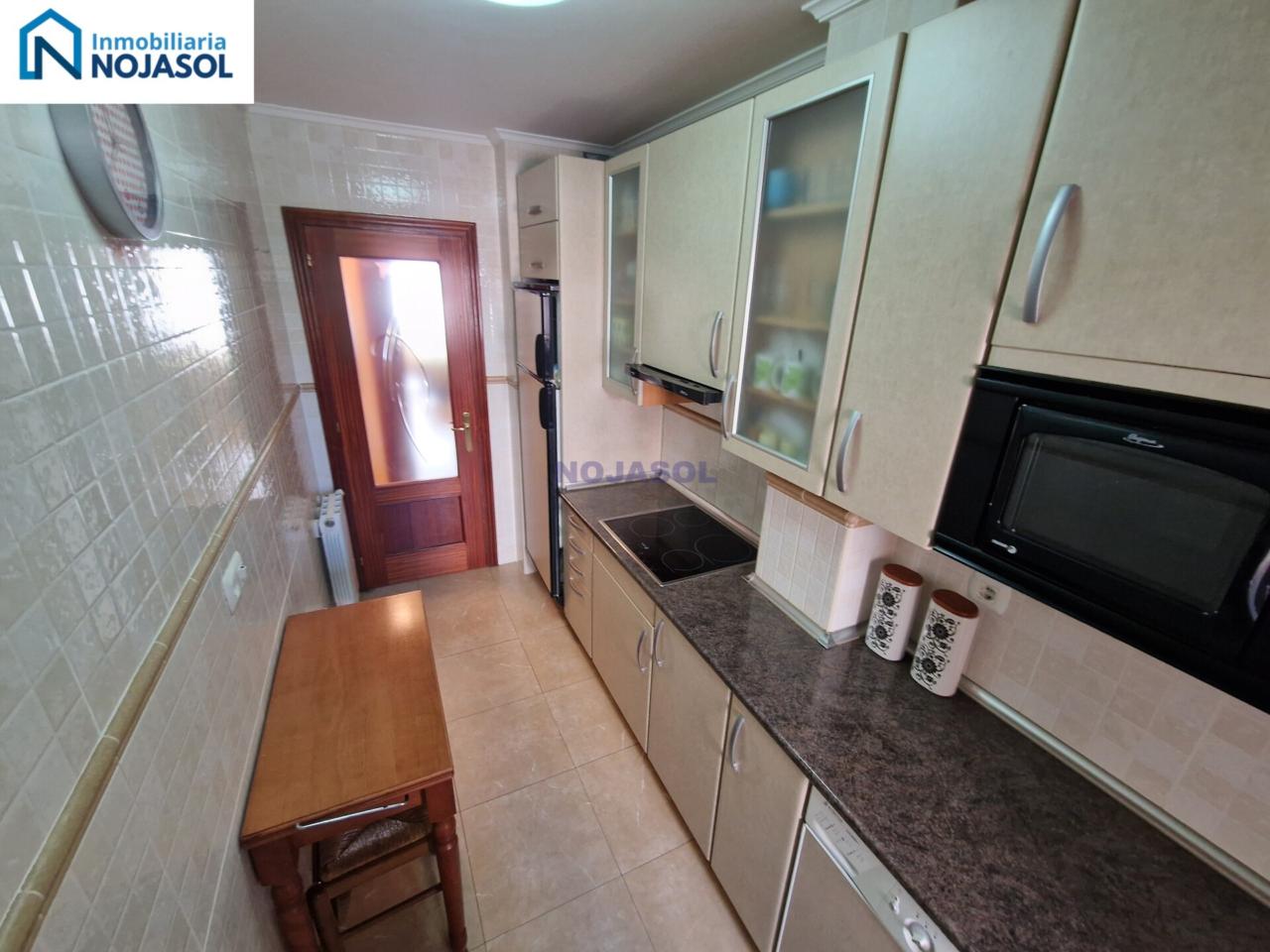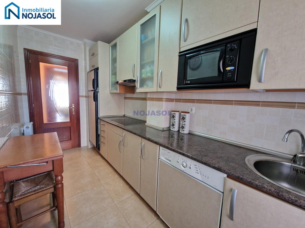 La cocina está completamente equipada con frigorífico, vitrocerámica, microondas y lavadora, y tiene salida a una terraza con zona de almacenaje, perfecta para organizar y disponer de espacio adicional. Su distribución práctica permite cocinar con comodidad y aprovechar al máximo la luz natural.