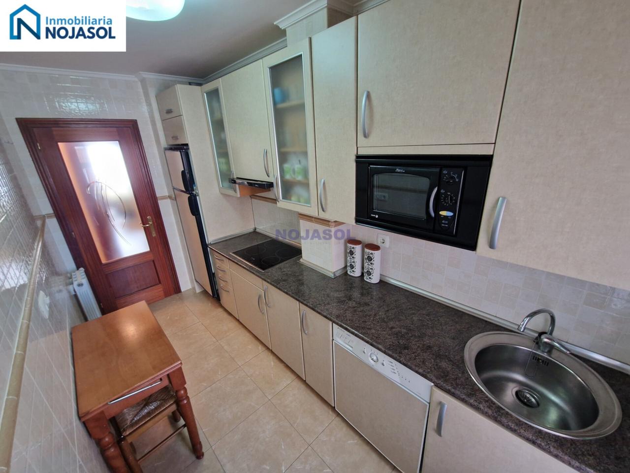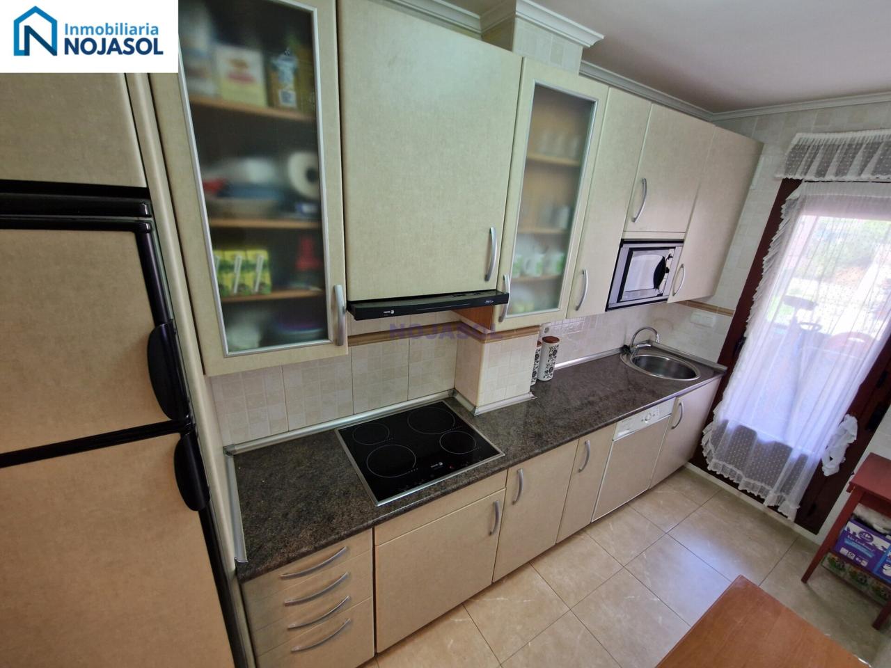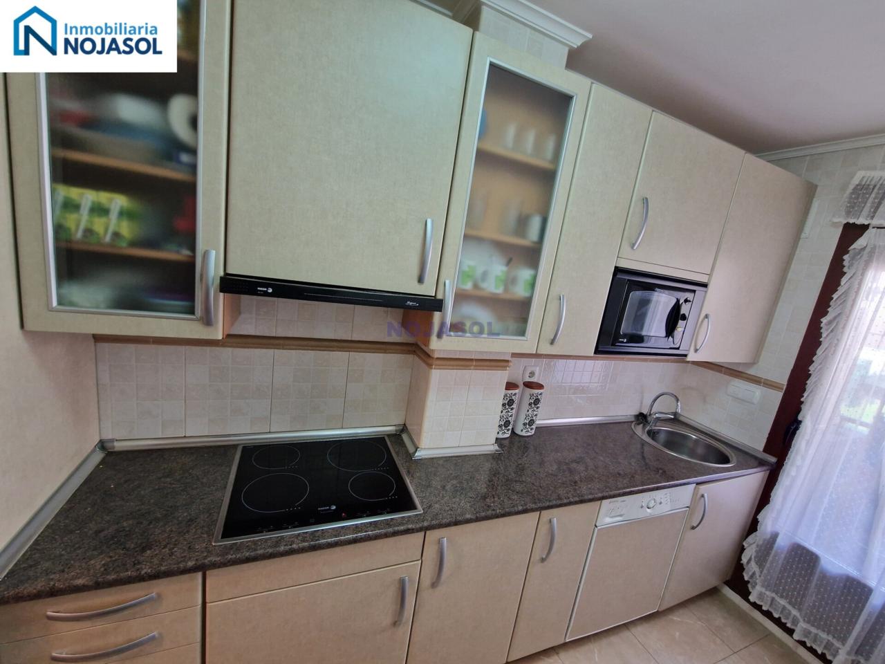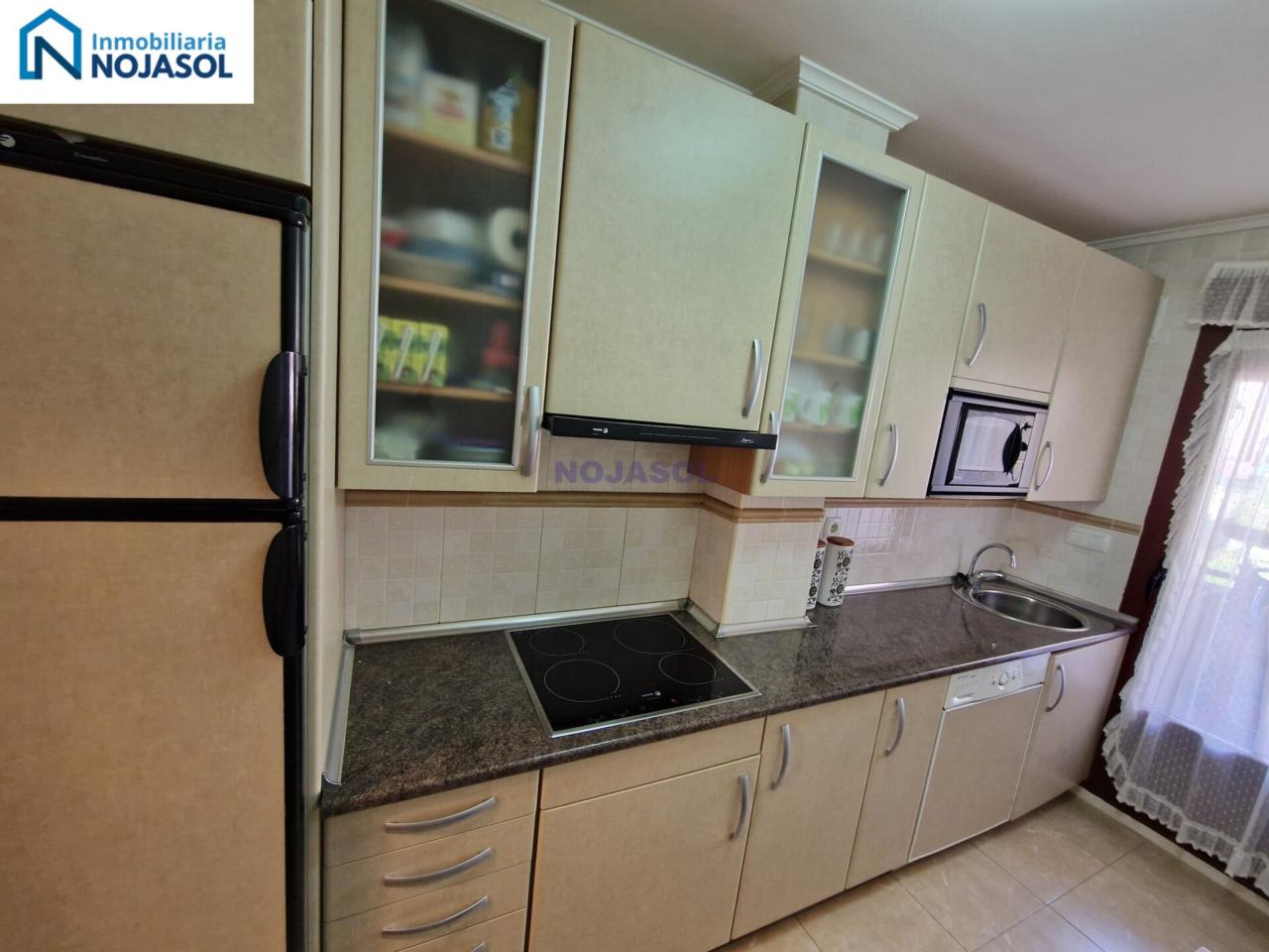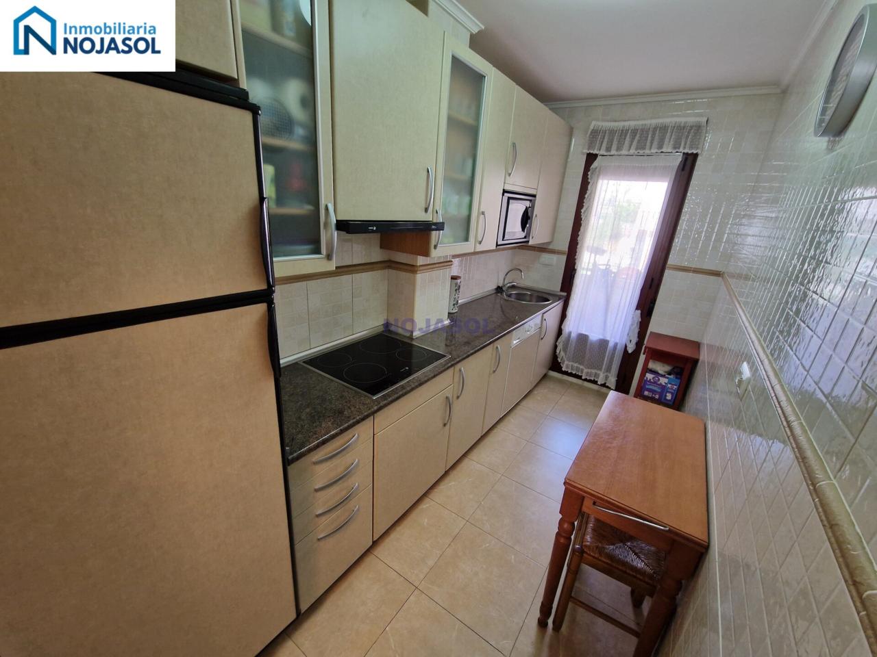 La cocina está completamente equipada con frigorífico, vitrocerámica, microondas y lavadora, y tiene salida a una terraza con zona de almacenaje, perfecta para organizar y disponer de espacio adicional. Su distribución práctica permite cocinar con comodidad y aprovechar al máximo la luz natural.
