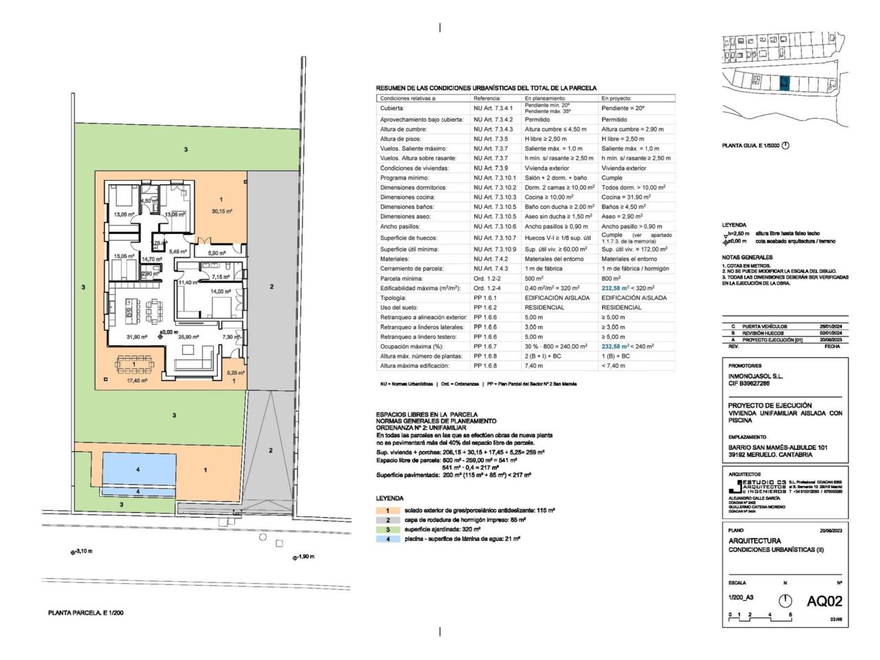 Terreno de 800m2 totalmente llano. Superficie ocupada por la vivienda: 240m2. M2 construidos de vivienda: 206m2. Terrazas sur y la norte (hace de garaje. Tiene 30m2 para dos coches) en total entre terrazas - porches son 58m2 construidos.