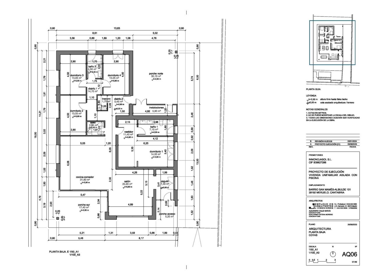 La vivienda se distribuye en 4 habitaciones; las dos de la orientación oeste son correderas para salir al jardín directamente. Dos baños completos (cada uno con ventana para su ventilación) y un aseo. Los baños se deja instalado los sanitarios (solo inodoro, platos de ducha y la grifería empotrada de los dos baños) pero no la mampara ni muebles. La grifería de las duchas será empotrada, dándole un toque mas moderno.