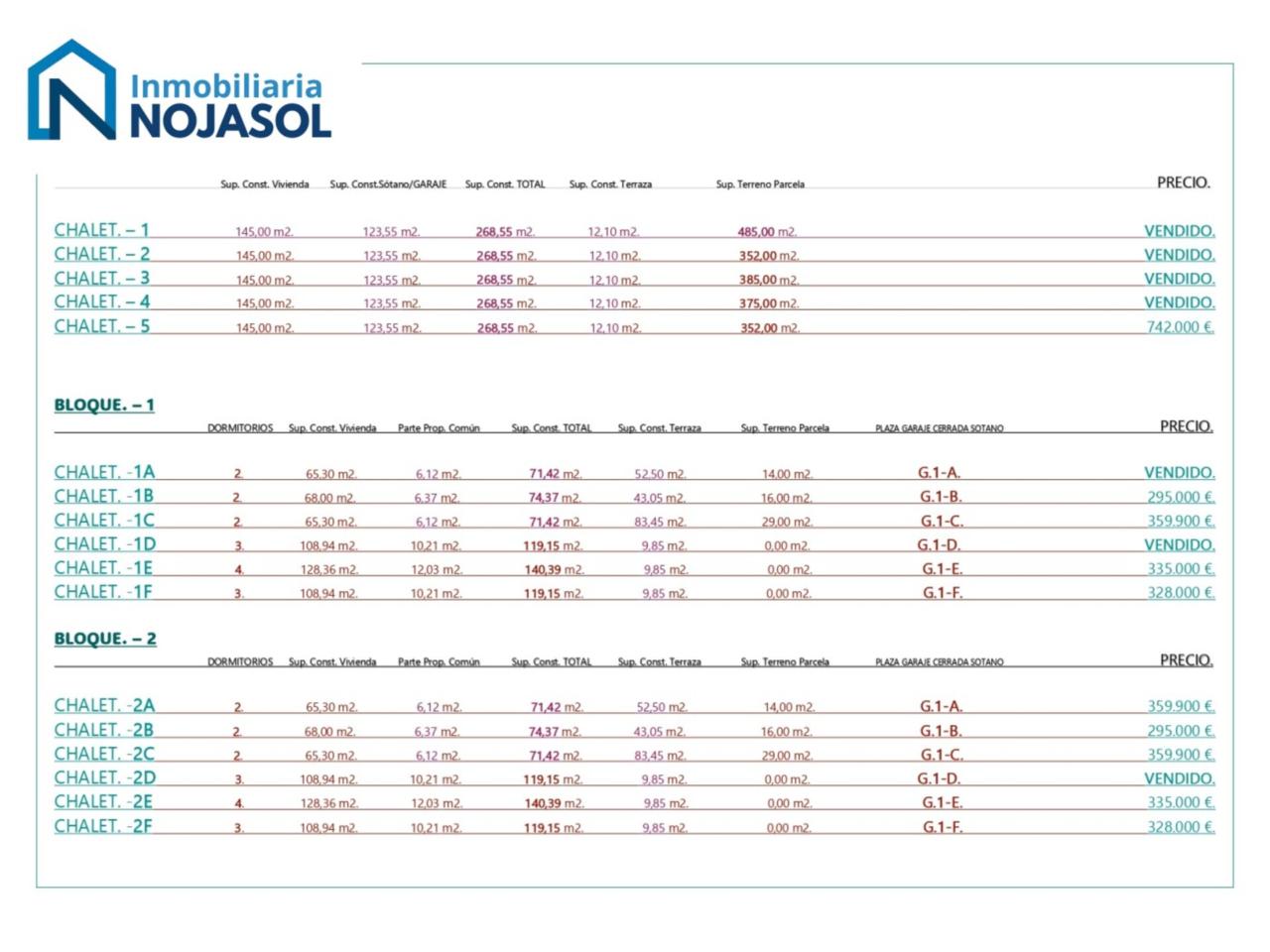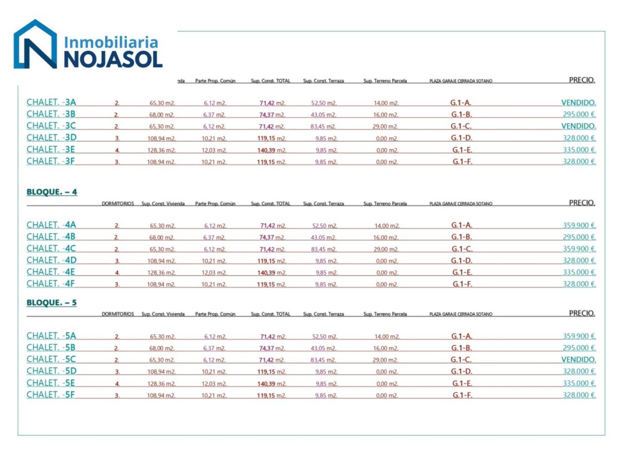 LOS PRECIOS DE CADA INMUEBLE DISPONIBLE ESTAN EN LAS FOTOS. (Precios directos del promotor). VENDIDOS: CHALET 1, CHALET 2, CHALET 3, CHALET 4, CHALET 5, 1A, 1D, 2D, 3A, 3C, 5C, 5E, 6A, 6D. EN IMÁGENES planos de cada inmueble.