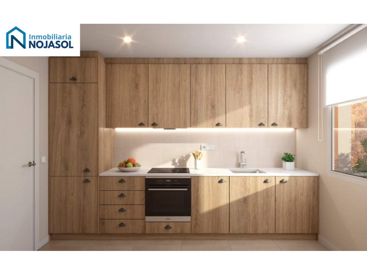 La cocina se entrega amueblada con diseño actual, muebles altos y bajos de gran capacidad y equipada con placa eléctrica, horno, microondas integrado en columna, fregadero de acero inoxidable y grifería monomando. El conjunto combina funcionalidad y estética en un espacio pensado para el uso diario.