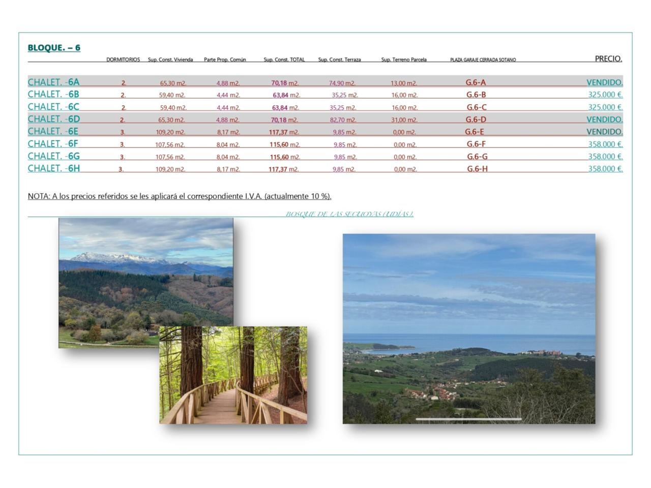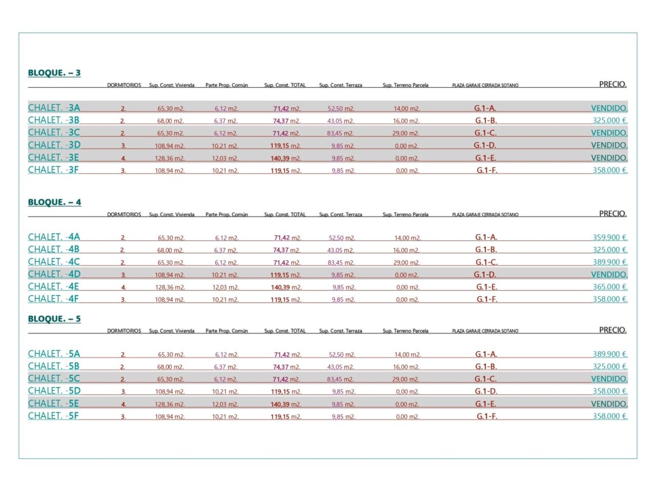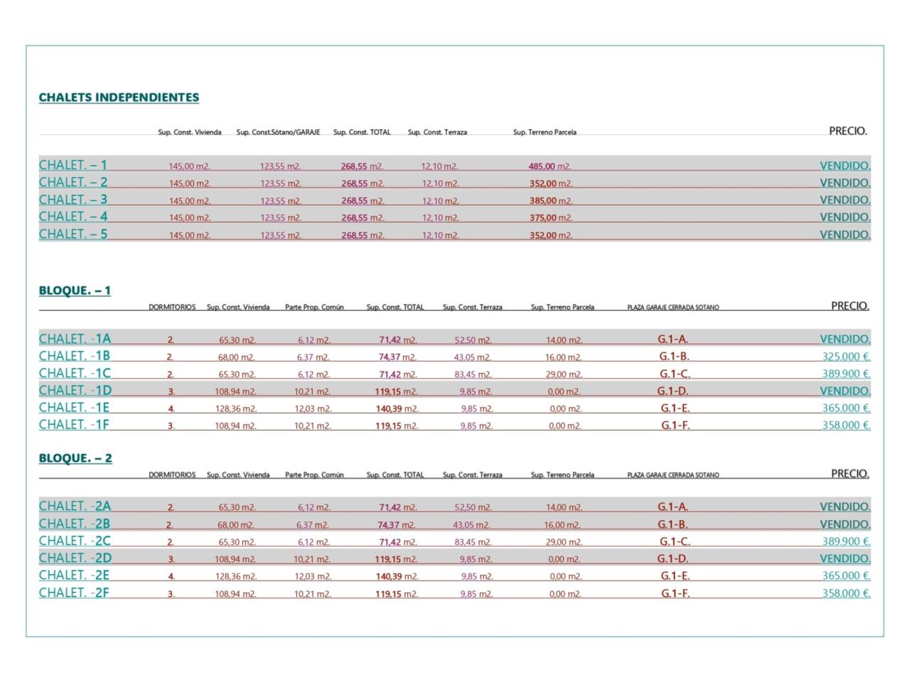 LOS PRECIOS DE CADA INMUEBLE DISPONIBLE ESTAN EN LAS FOTOS. (Precios directos del promotor). VENDIDOS: CHALET 1, CHALET 2, CHALET 3, CHALET 4, CHALET 5, 1A, 1D, 2A, 2B, 2D, 3A, 3C, 5E, 5C, 5E, 6A, 6E 6D. EN IMÁGENES planos de cada inmueble.