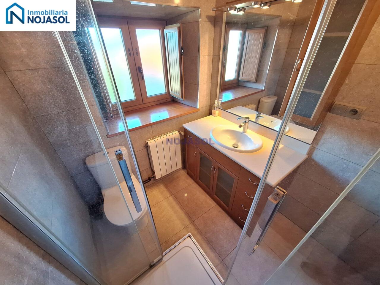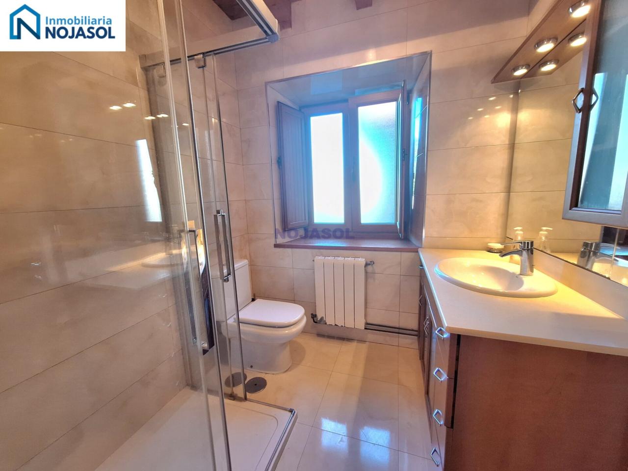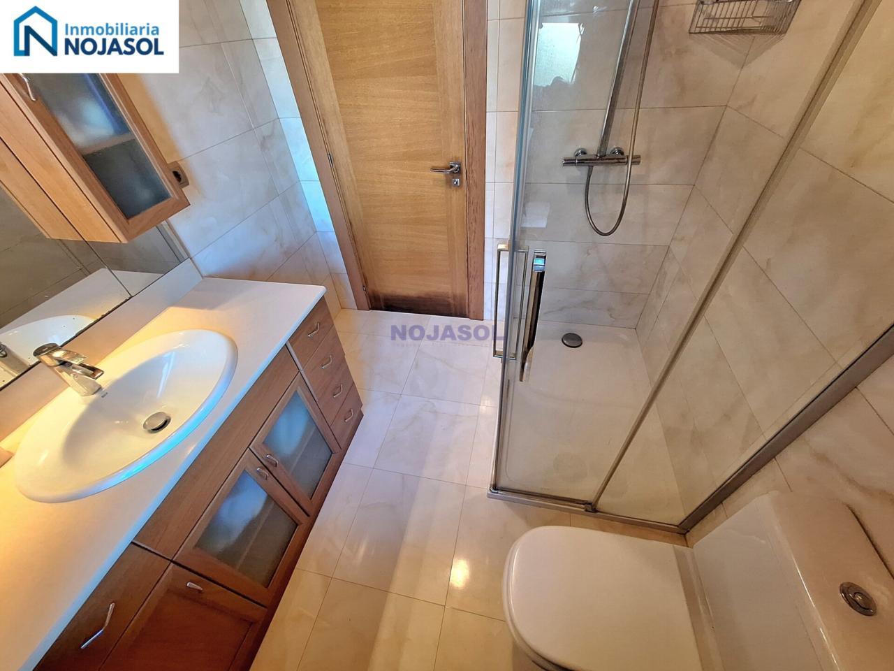 Un baño completo con plato de ducha, con un armario bajo el lavabo para guardar las cosas de higiene. Y tiene una ventana que hace mucho mas fácil su ventilación.