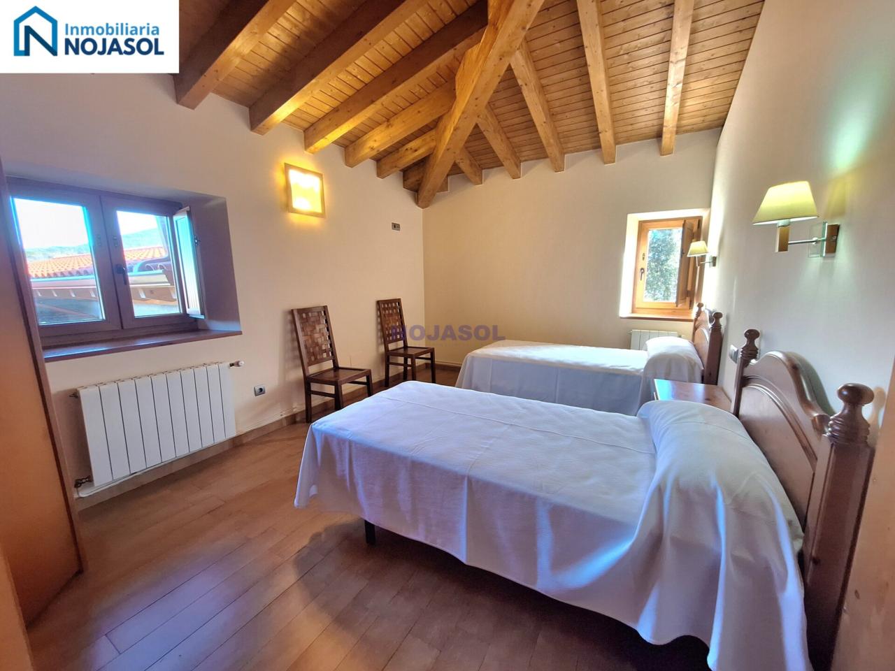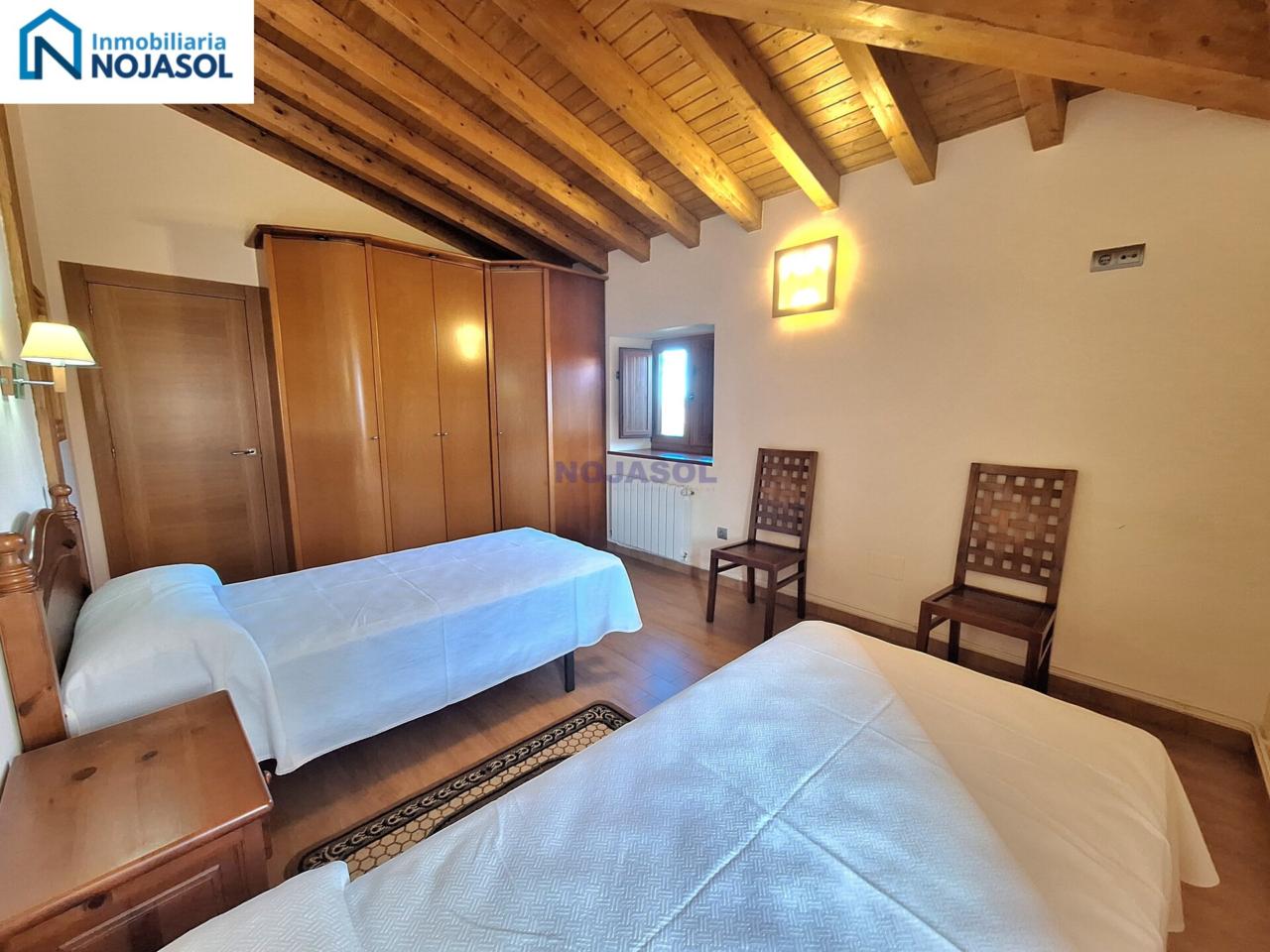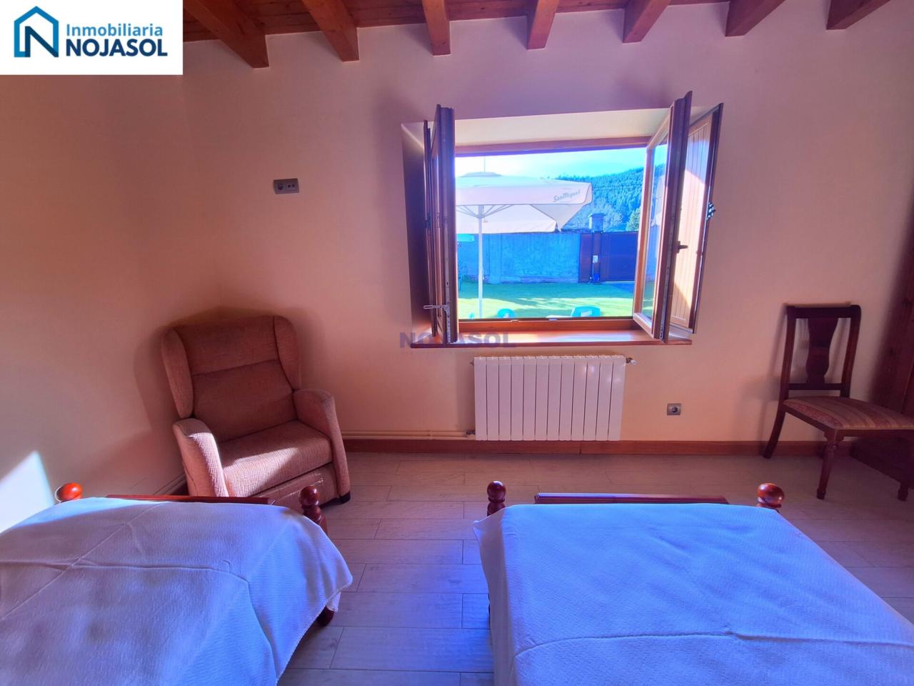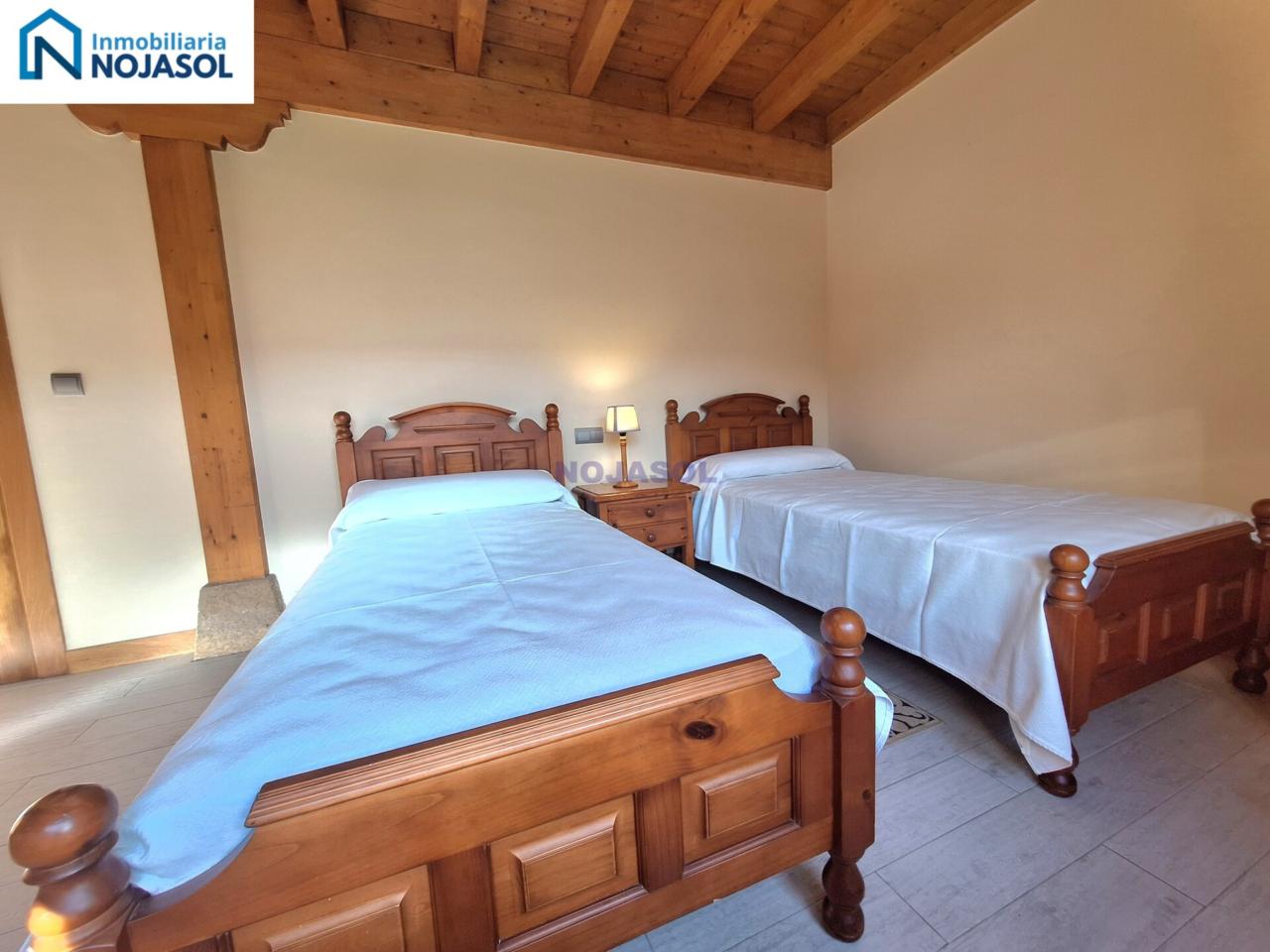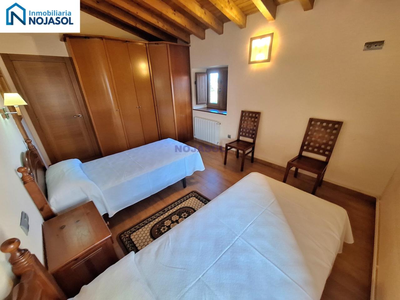 El inmueble se distribuye en dos plantas. La planta baja cuenta con 2 habitaciones, una con dos camas individuales (0,90) y otra con una cama de matrimonio (1,35) con vistas al jardín y orientación Sur que hace que tengamos luz durante todo el dia.