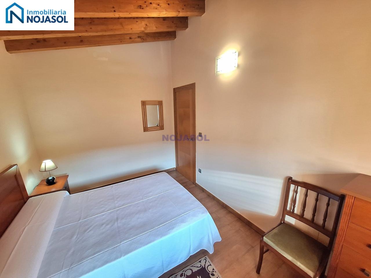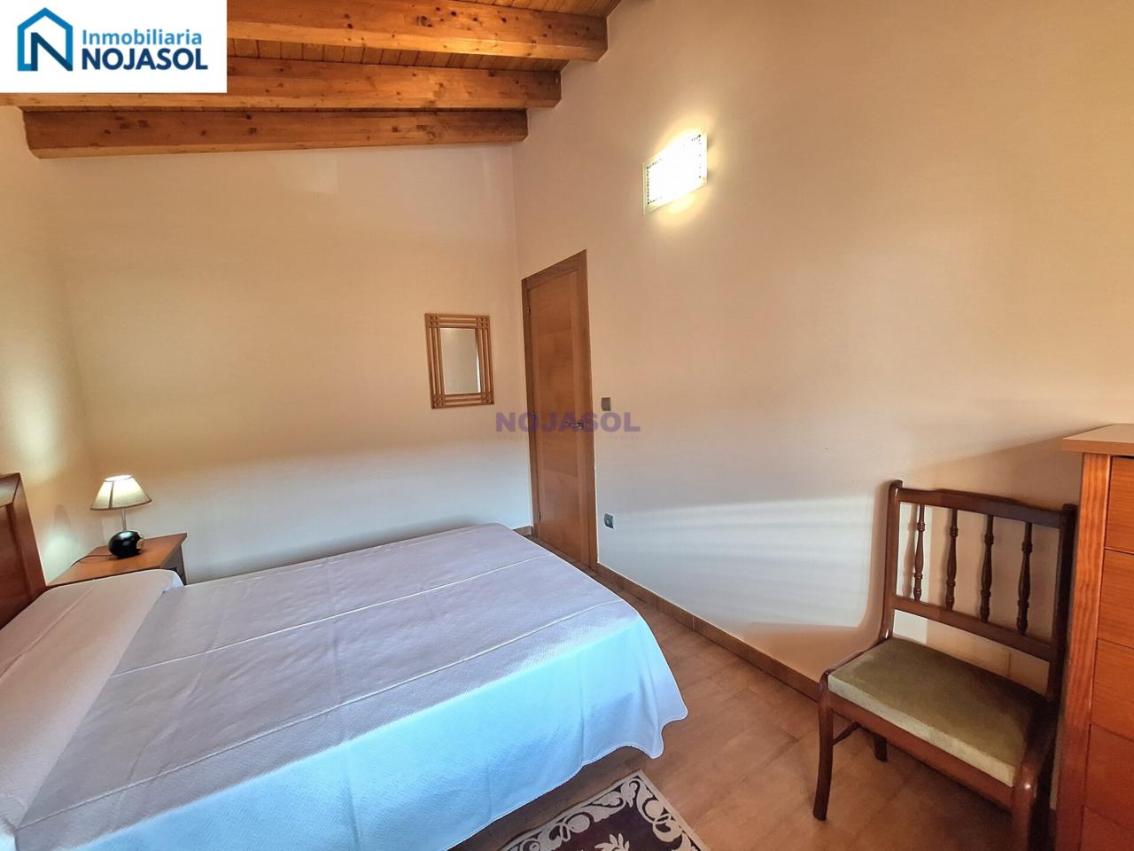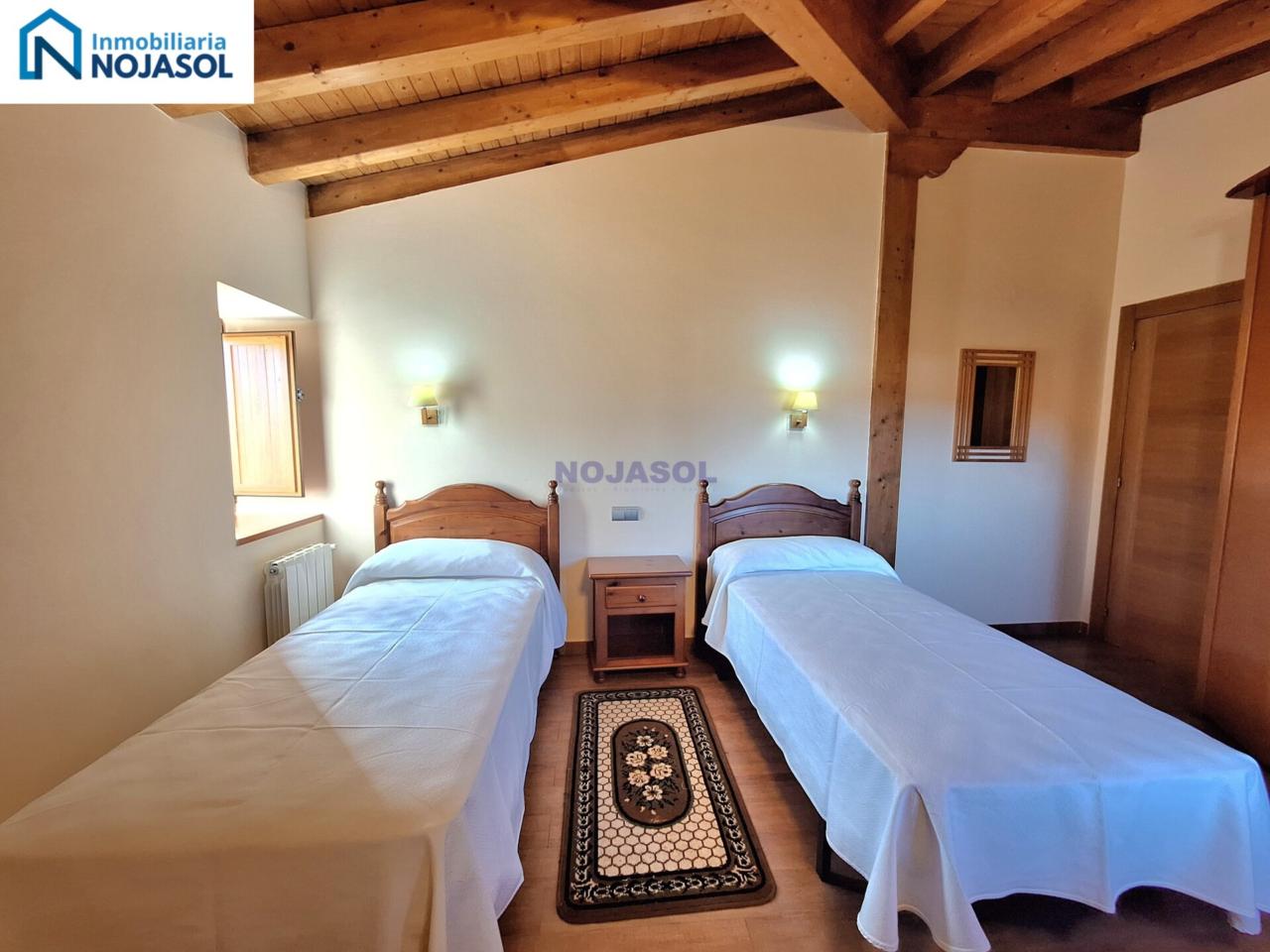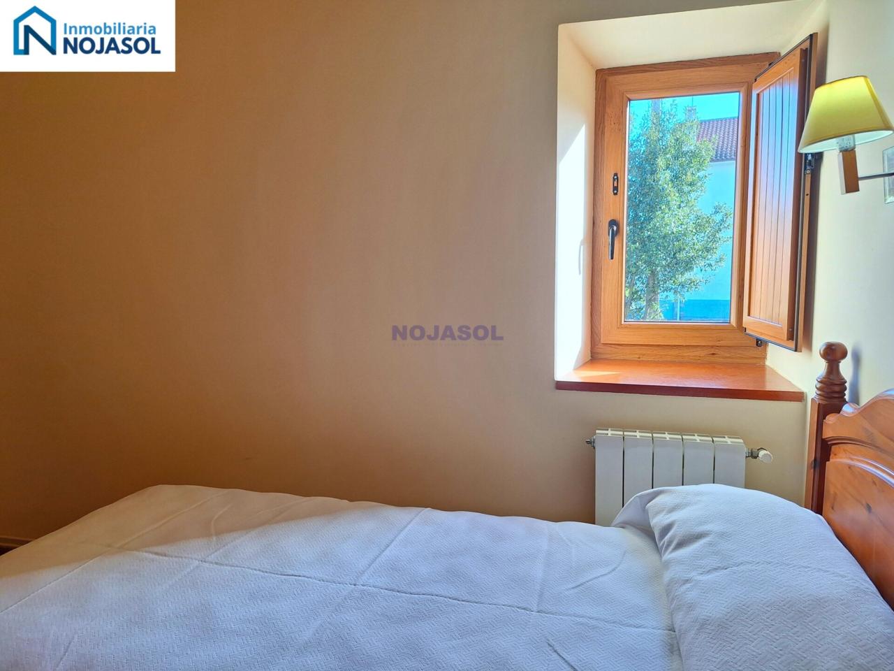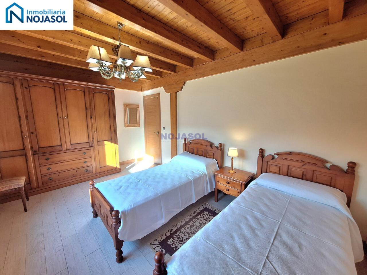 El inmueble se distribuye en dos plantas. La planta baja cuenta con 2 habitaciones, una con dos camas individuales (0,90) y otra con una cama de matrimonio (1,35) con vistas al jardín y orientación Sur que hace que tengamos luz durante todo el dia.